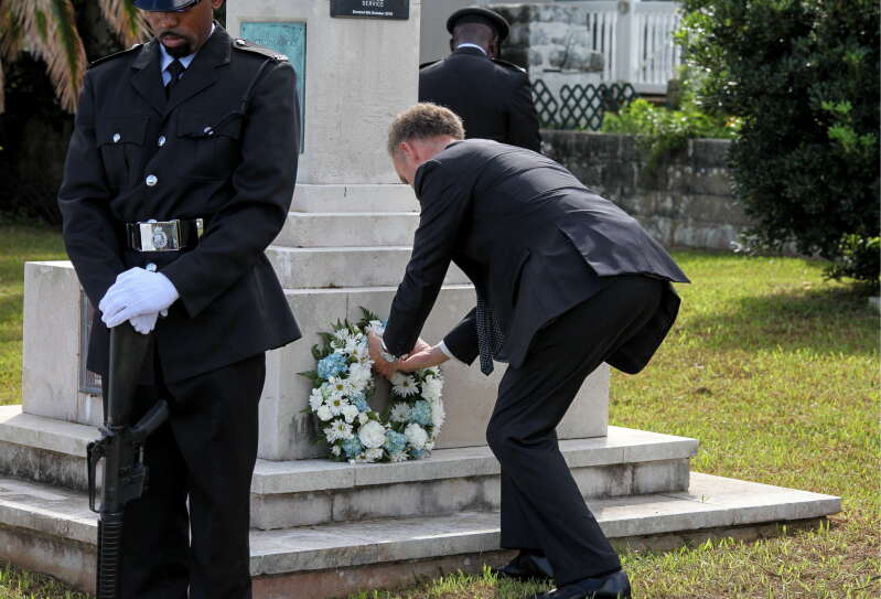 Governor George Ferguson lays a reef at the base of the Memorial for Deceased Comrades during the Bermuda Police Service Memorial service held at the Military Cemetery behind Alexandra Road in Devonshire.