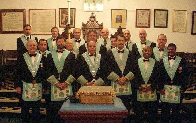 Wor Bro Zachary Sagurs with his officers installed for the year 2012. Front row the left, Immediate PM W Bro David A. Le?Strange, SW Bro Patrick D Caton, WM W Bro Zachary J Sagurs, JW Bro S Douglas Parker, JD Bro. Jeffrey M Lewis, and Treasurer W Bro Dueane S Dill, Past Master. Middle row, left to right, Tyler Bro Barry S Lewis, Steward of Charities W Bro Dudley R Cottingham, DG Reg, SD Bro Bradley A. Woodings, Steward Bro. Charles D Morgan, and Almoner W Bro Stephen W. Kempe P.Dist.G.St.B. Back row, l-r, Steward Bro, Steven J. Pacheco, Asst. D. of C. W. Bro. William H. Mayor, Jr., D.J.G.D., Organist W. Bro. Ian D. MacIntyre, D.G.Chty.Stwd, Chaplain W. Bro. Keith O. DeSilva, P.Dist.G.St.B., Steward Bro D. Scott Tavares, and Secretary W. Bro. Thad A. Hollis, D.G.St.B. Not shown, D. of C. W. Bro. Michael E. Smith, D.G. Tyler, Asst. Secretary W. Bro. Benjamin J. Frith, P.M. and Inner Guard Bro. Wendell E. Ebbin.