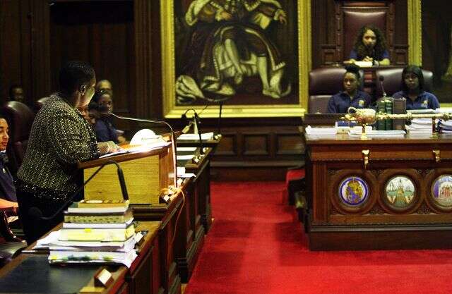 The Youth Parliament of Bermuda held its "Reconvening of Youth Parliament" ceremony yesterday at the House of Assembly. Youth Premier Rayn Robinson speaks to the House of Assembly during yesterday's ceremony. (Photo by Akil Simmons)