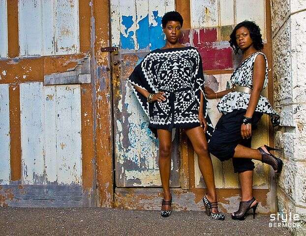 Geometrics: Picking patterns that draw the eye for a sophisticated look. Davika Hill, Miss Warwick East wears BCBG Maxazria printed tunic available from Gibbons Co. Cheyenne Darrell, Miss St. George’s West wears BCBG Maxazria printed shirt, and BCBGeneration pants available from Gibbons Co.; bangle from Jazzy Boutique.