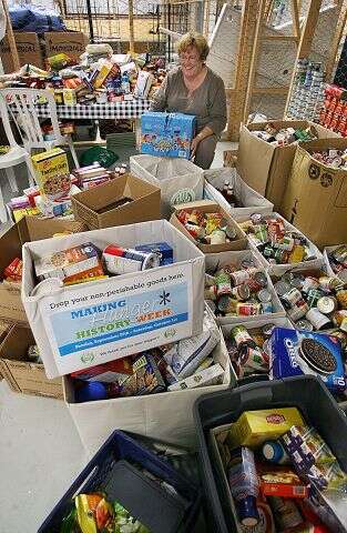 Enough food for everyone: Eliza Dolittle Society executive director Margaret Ward sorts boxes of food at the hands of Love headquarters in Paget yesterday. Hundreds of cans and packages of non perishable food have been donated to help feed those in need around Bermuda.