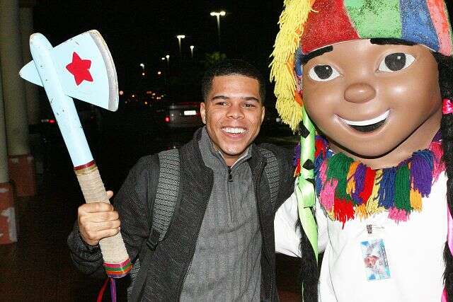 Actor Lance Gross, known for his role as Calvin Payne in Tyler Perry's House of Payne is greeted by AJ The Little Gombey at L.F. Wade Airport Friday night. ( Photo by Glenn Tucker )
