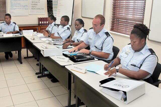 Ready to serve their community new police recruits PC 2453 K Taylor, PC 2499 J Overbey, 2452 J talbot, PC 860 D Evans, PC 2455 K Wade and PC 2450 M Simons put in work during a class at the police training facility in Prospect Devonshire Thursday ( Photo by Glenn Tucker )