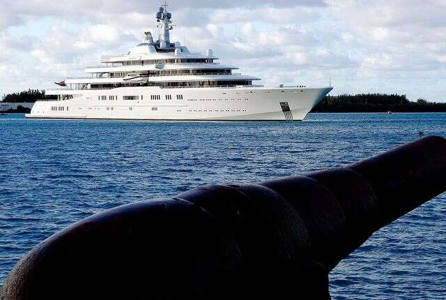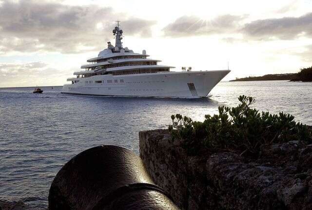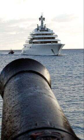 Photo by David SkinnerThe Bermuda-registered motor yacht Eclipse enters the reefline on its approach to Town Cut, St George's yesterday, as an ancient cannon at Gates Fort is shown in the foreground. The giant yacht is owned by Russian tycoon and Chelsea football club owner Roman Abramovich, and is the largest in the world at 557ft long is valued at $475 million. It has two helicopter pads, 24 guest cabins, two swimming pools, several hot tubs and a disco hall. It is also equipped with three launch boats and a mini-submarine that is capable of submerging to 50 metres. Approximately 70 crew members are needed to operate the yacht.