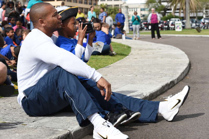 Parents eagerly video tape their kids performances at the Week of the Young Child's official opening on the steps of City Hall where schoolchildren gathered and performed for their families and teachers. The event was organized by the Bermuda Association for the Education of Young Children (BAEYC) in conjuction with the Child Development Programme. Speakers emphasized the importance of behavioural intervention and classroom management in childhood development. (Photo by Nicola Muirhead)