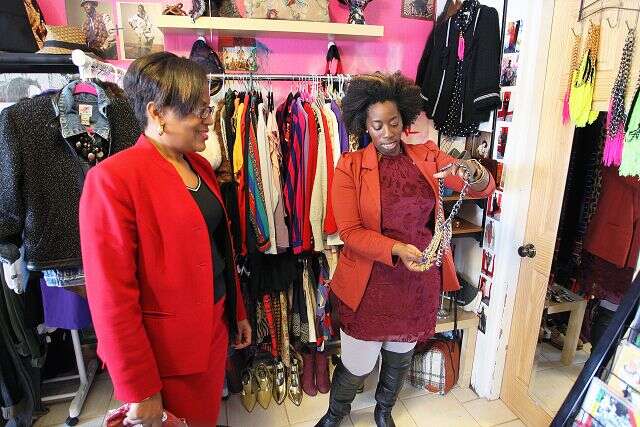 Looking to buy: Economy Minister Patrice Minors is shown accessories by Inna Heights shop owner Maya Furbert, the Minister visited retail stores in the City of Hamilton varying from Court Street to Front Street last Friday.